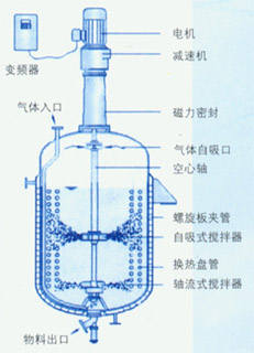 該攪拌器由上下兩層攪拌器組成,下層推進(jìn)式攪拌器具有分散進(jìn)氣、懸浮催化劑的功能,而上層自吸式攪拌器具有將液面上的氣體重新吸入并分散于液相的特殊功能,從而大幅度提高了氣液的混合效果。